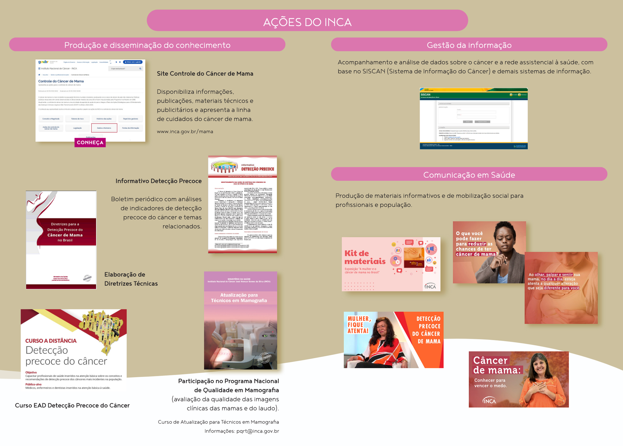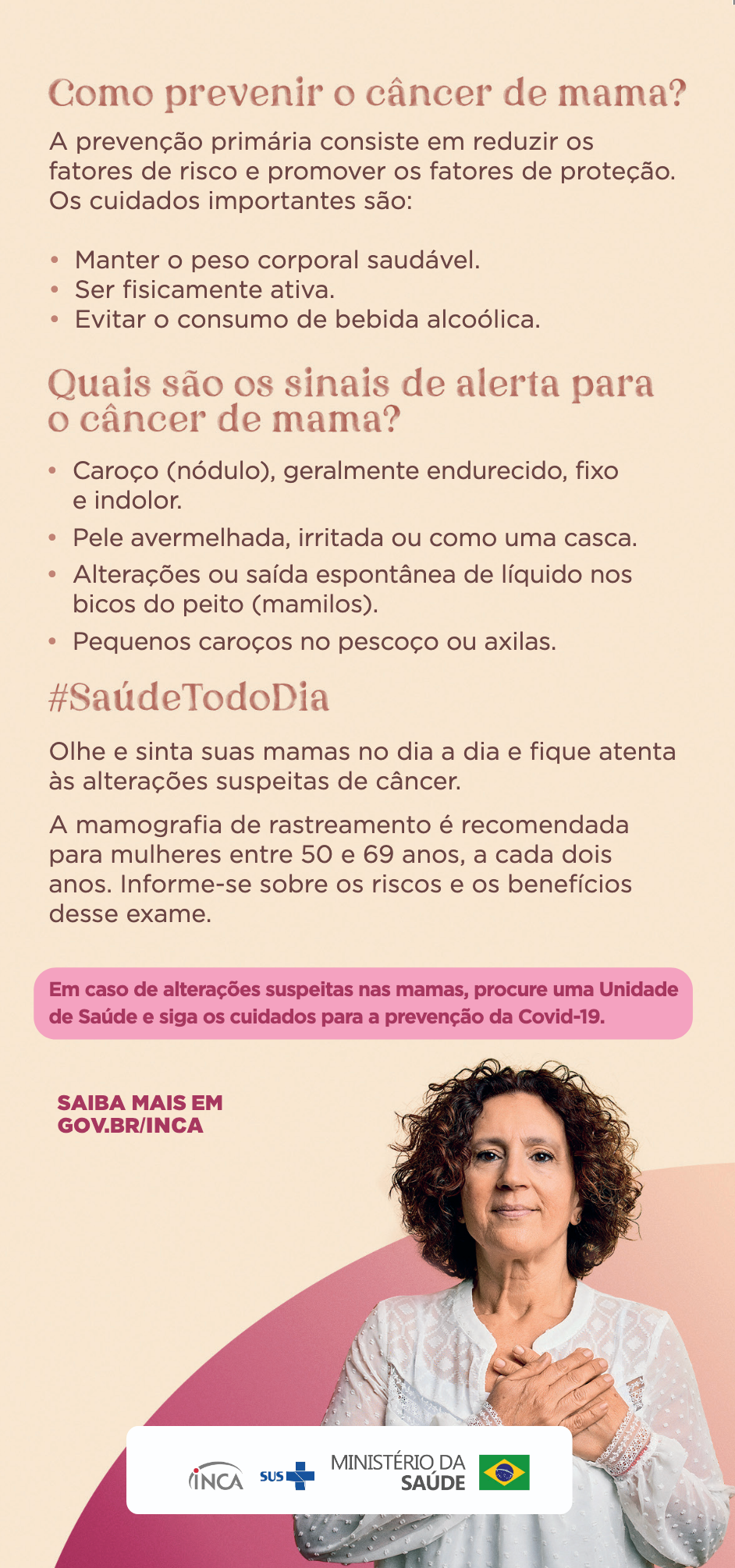- Sinais e sintomas: Como identificar alterações na mama, como nódulos, inchaços, secreções ou mudanças na pele.