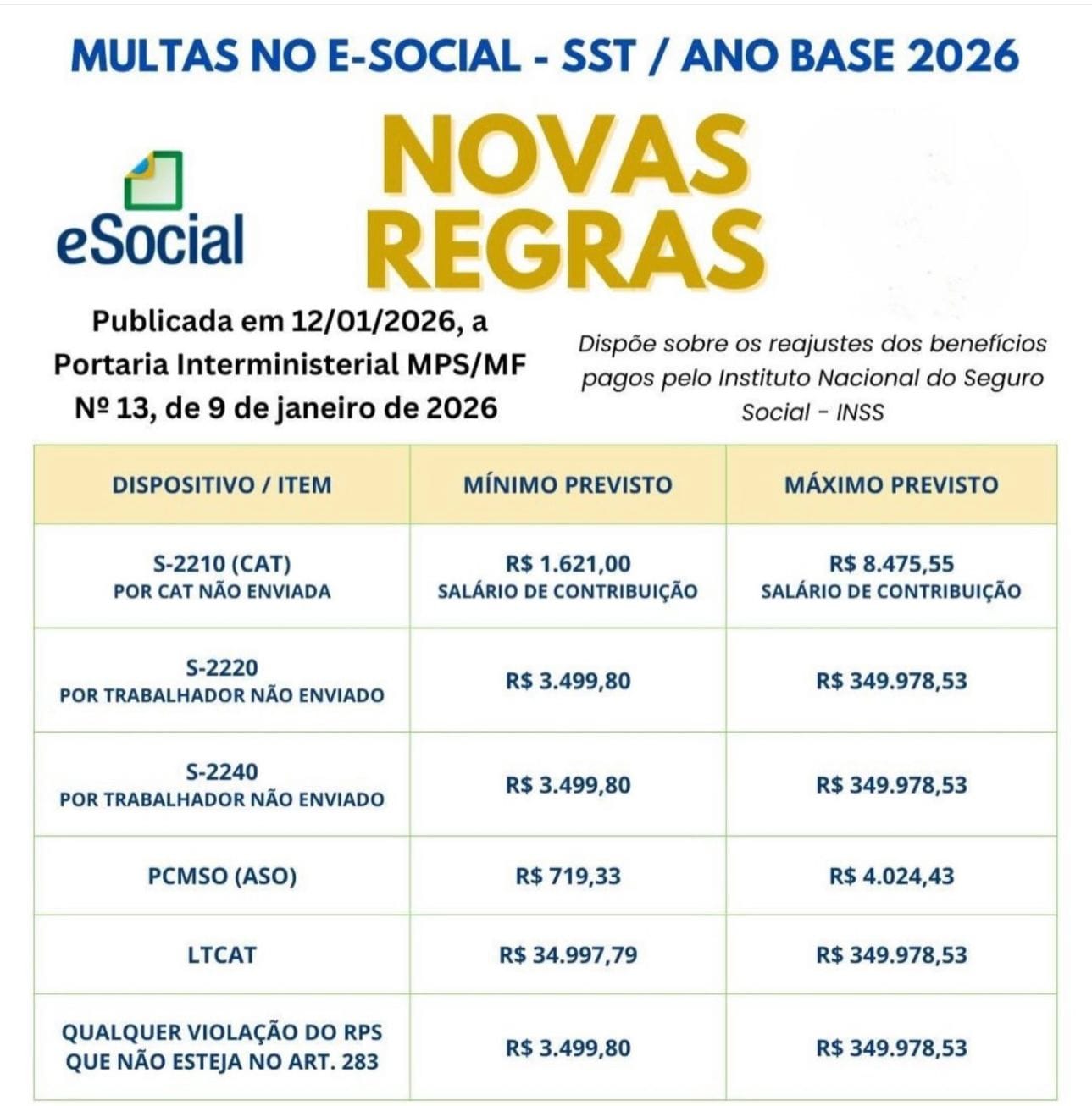 Em 12/01/2026 foi publicada a Portaria Interministerial MPS/MF nº 13/2026, que reajustou os valores-base das multas do Regulamento da Previdência Social. Com isso, penalidades relacionadas à Saúde e Segurança do Trabalho (SST) passaram a ter impacto financeiro muito maior, podendo atingir quase R$ 350.000 em casos isolados.